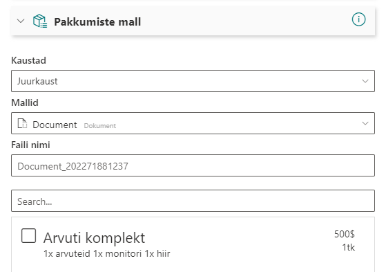 Pakkumise koostamiseks saad valida sobiva dokumendimalli ning tooted/teenused, mis malli kaasatakse.