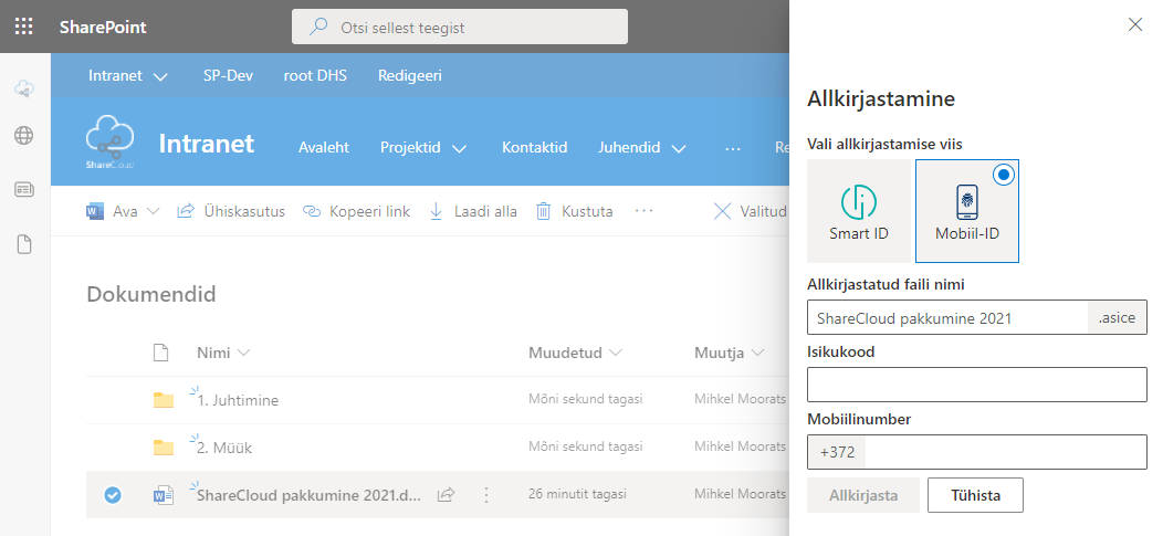 vali dokument või dokumendid, mida soovid allkirjastada ning klõpsa nupul „Allkirjasta", mis asub käsureal
