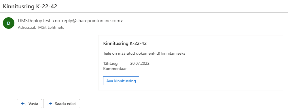 Dokumendi kinnituse edukalt ärasaatmisel saab(vad) kinnitaja(d) ja teavitaja(d) emaili, kus öeldakse, et dokumenti(d) on vaja kinnitada.