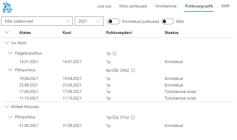 Puhkuse graafiku vaates on võimalik näha kõiki puhkuseid üheskoos. Vaheleht on nähtav kõigile kasutajatele. Vaadet on võimalik filtreerida aastate ja osakondade kaupa.