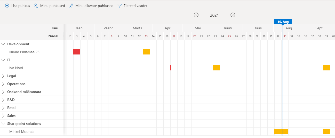 Kõik puhkused kuvatakse koondina aastavaates ja on värvidega eristatud vastavalt avalduse kinnitamise staatusele.