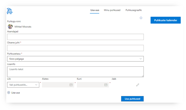 Puhkuste lisamiseks navigeerige puhkusavalduse vormile: