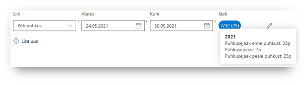 Süsteem arvutab automaatselt puhkusejäägi kuvades välja:
