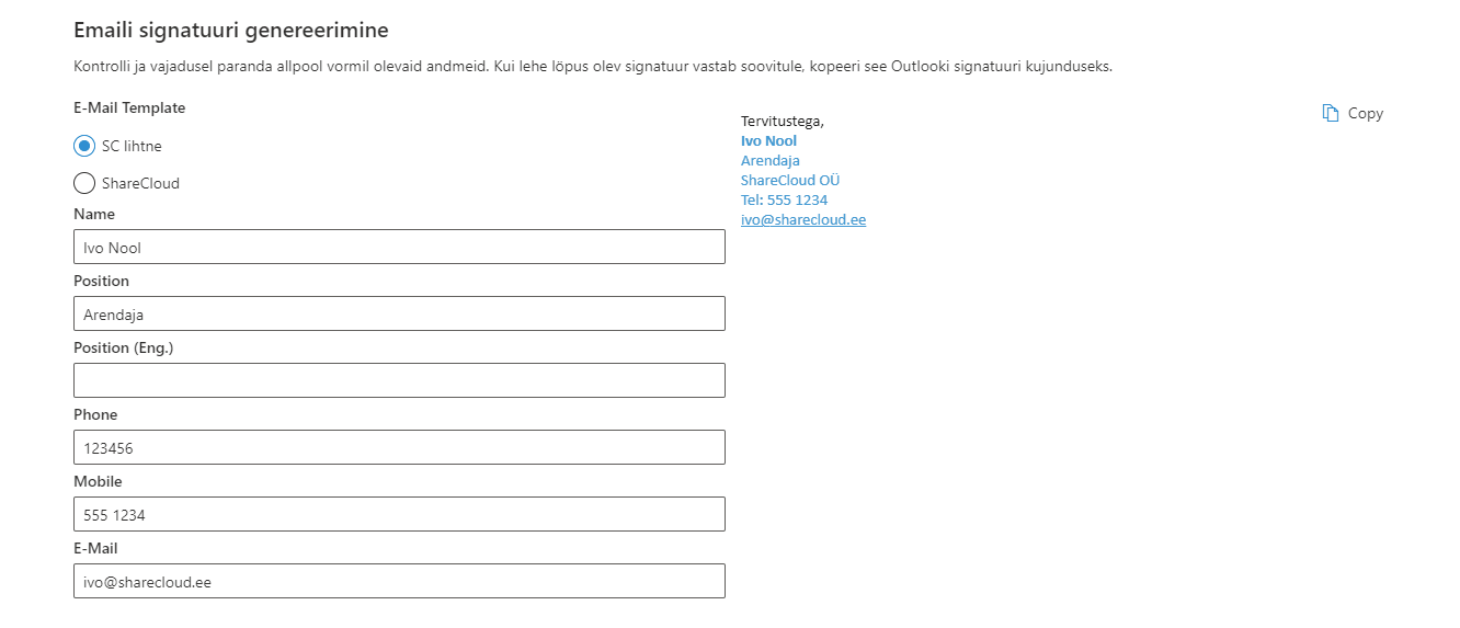 E-maili signatuuri genereerimise veebiosa võimaldab lihtsasti luua signatuuri e-maili jalusesse. Lehe laadimisel laetakse kasutaja andmed AD-st. Kõiki andmeid saab muuta ja täiendada.