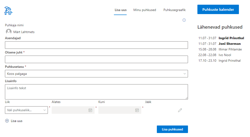 Kogu puhkuste protsess on automatiseeritud alates avalduse esitamisest kuni puhkuste ajakava koostamiseni.