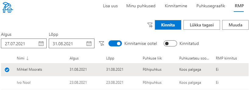 Lisaks saab puhkuseid filtreerida puhkuse alguse, lõpu või kinnitamise staatuse järgi.