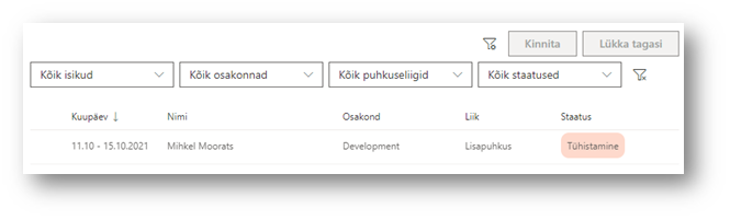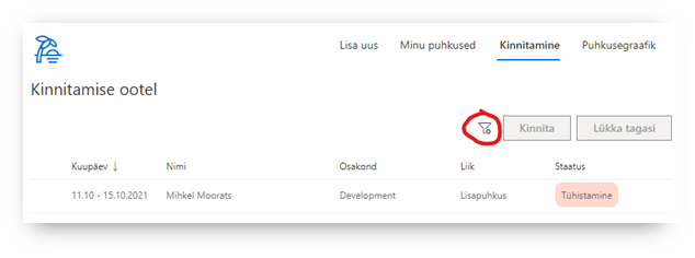 Avaneb filtrite paneel, kus saab kinnitamise ootel puhkuseid filtreerida järgmiste muutujate alusel: